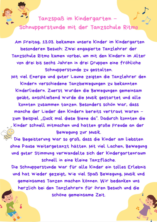 Tanzspaß mit der Tanzschule Ritmo Beitrag veröffentlicht:16. März 2026 Das könnte dir auch gefallen ADAC-Verkehrstraining für die Vorschulkinder 9. April 2025 Besuch vom Zauberclown Emma 20. Juli 2023 Erntedank im Märchenhaus 12. Oktober 2023